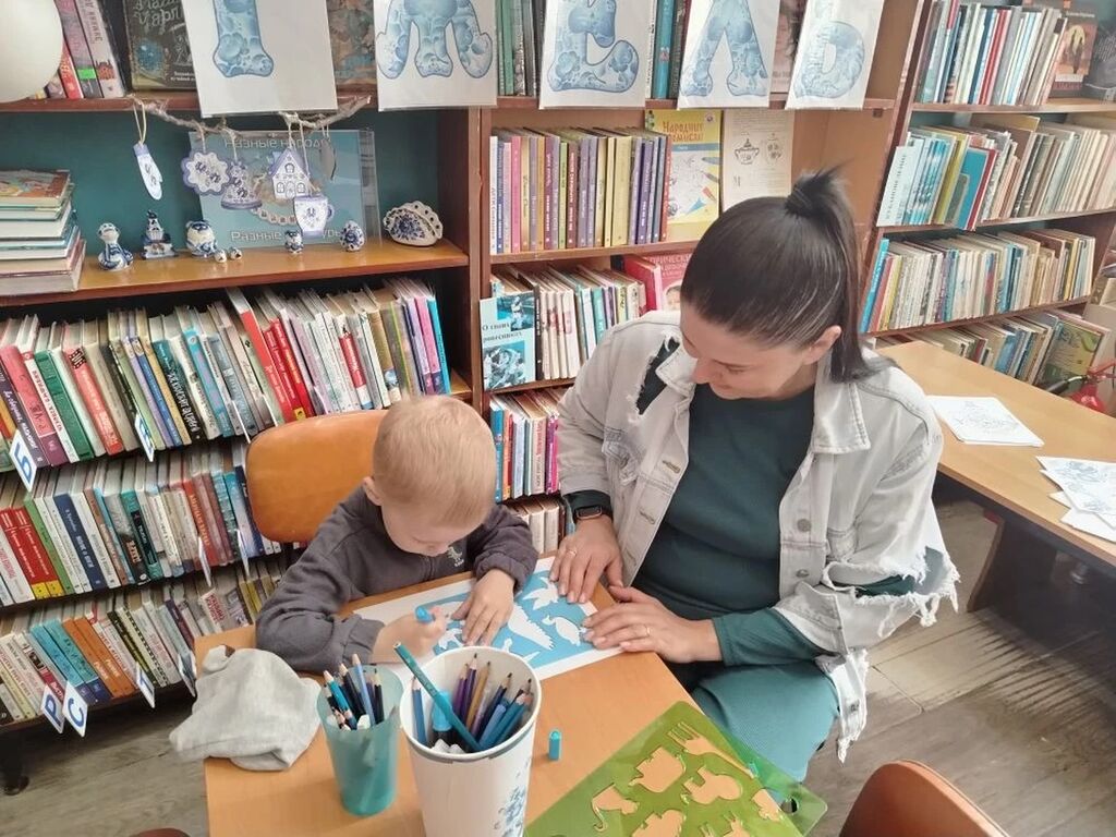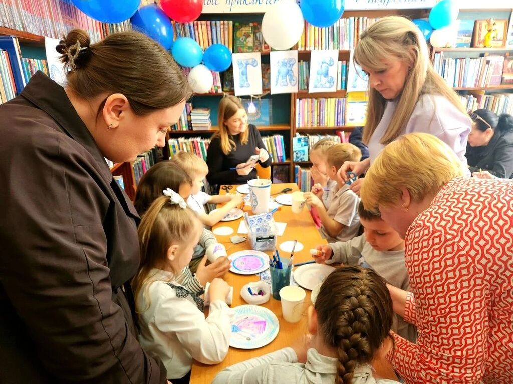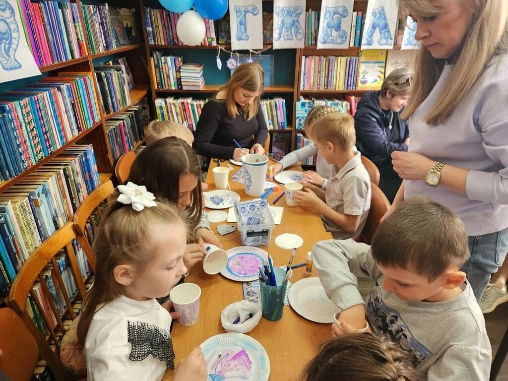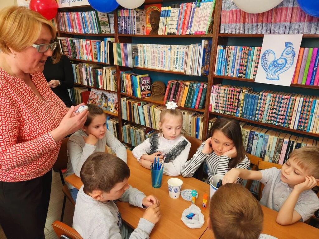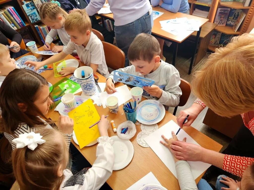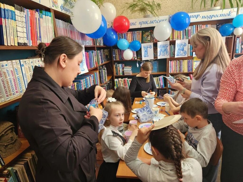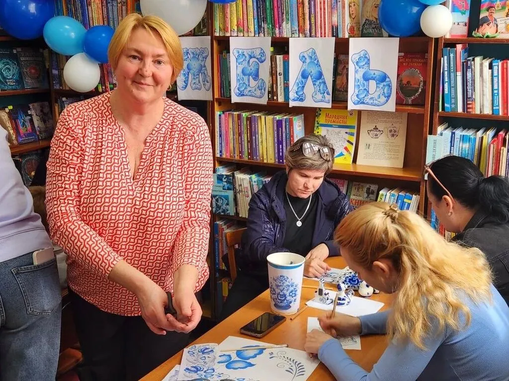 Мастерская народных промыслов расположилась на старшем абонементе. Все желающие смогли принять участие в мастер-классе, который был посвящен гжельским узорам.